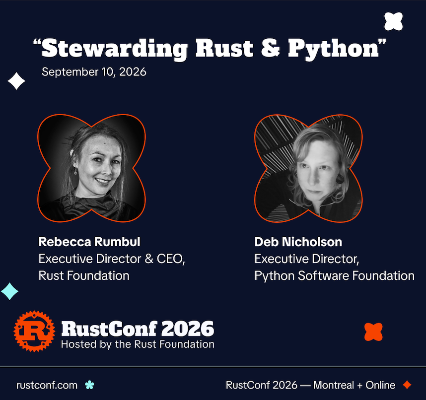 The Rust Foundation’s Executive Director & CEO Rebecca Rumbul will sit down with Python Software Foundation Executive Director Deb Nicholson for a candid conversation about what it actually takes to steward two of the world’s most widely-used programming languages.